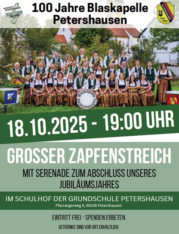 Am Samstag, den 18. Oktober 2025 um 19:00 Uhr findet im Schulhof der Grundschule Petershausen der Große Zapfenstreich statt – ein musikalisches und feierliches Highlight, das den würdigen Schlusspunkt unseres Jubiläumsjahres setzt.